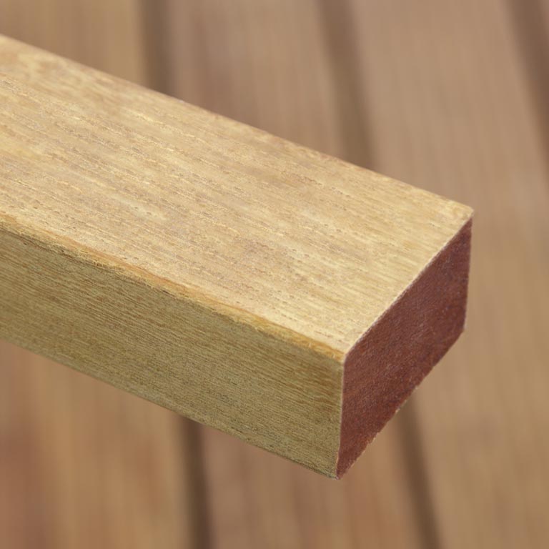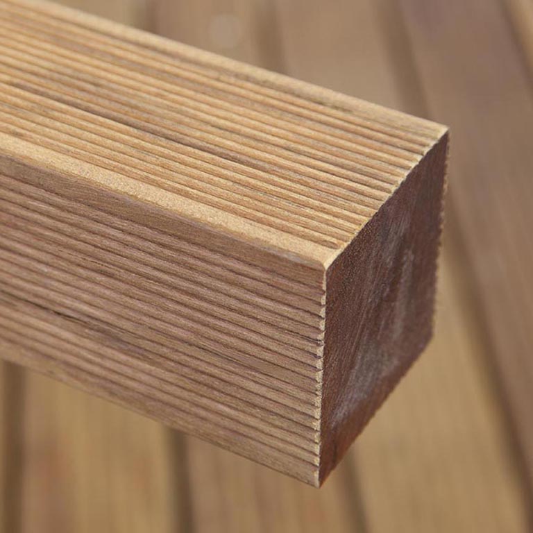La sous-structure est la base de chaque terrasse en bois. Il fixe non seulement les lames de terrasse, mais assure également une ventilation adéquate du bois. Il est posé sur un sol ferme et plat avec une légère pente à l'écart du bâtiment. Le bois de construction ne doit pas reposer directement sur le sol, mais doit être posé, par exemple, sur des dalles de pavage comme surface d'appui. Les patins en granulés de caoutchouc compensent les irrégularités.