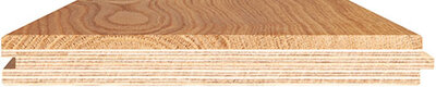 Landhausdiele im 2-Schicht Aufbau. Nutzschicht ca. 4 mm Eiche, Trägerplatte Birke Sperrholz (EU-Produktion). Umlaufende Fase. Produktion nach DIN EN 13489.